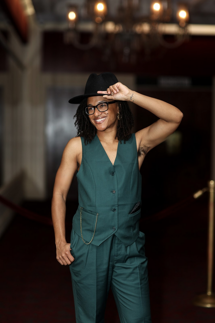 Associated Artist, Haileigh Nelson, pictured in the foreground of the Apollo Theater foyer wearing a forest green suit (pants and vest) and black fedora hat. Haileigh’s hair is micro loc’d and styled down underneath their hat. Haileigh is also wearing green-framed glasses and is smiling showing their teeth. Haileigh’s vest has a gold pocket watch chain in the right pocket and a black satin pocket square in the left. Haileigh has their right thumb placed in their pocket and left hand holding onto the black fedora hat they are wearing—exposing their natural armpit hair.